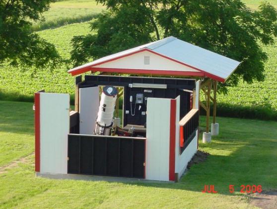 Hawkeye Observatory was built in 2006. It is 14' x 16' roll off roof design. It is located 42°26'20.20"n by 89°19'35.24"w at an elevation of 758'. The main feature is the three drop down walls to add to viewing pleasure. I also have the Scope connected into the house with a LAN. |